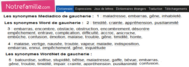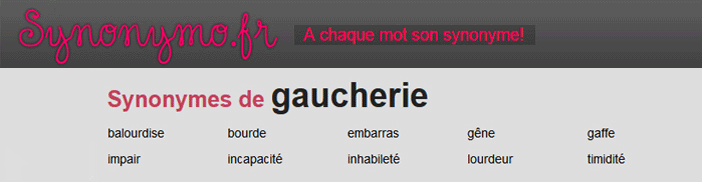 Vous remarquerez aussi, que la plupart des sites qui donnent la définition et les synonymes de gaucherie, citent au minimum : embarras ou maladresse, mais dans l’ensemble ils ne sont pas avares de synonymes qui seront loin de flatter ceux qui sont taxés de “gaucherie”, comme vous pouvez le voir dans le visuel en haut de page ou celui-ci :