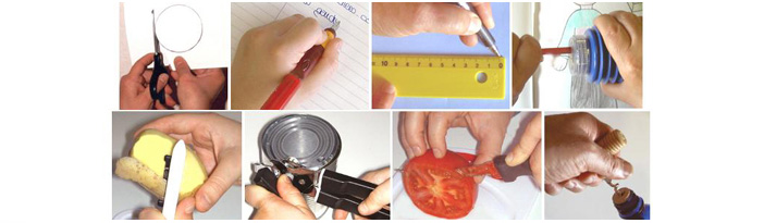 Les taille-crayons : il est naturel pour un gaucher de le tenir dans la main droite et de tourner le crayon avec la main gauche dans le sens inverse des aiguilles d’une montre, les lames sont donc inversées afin d’utiliser ces gestes sans contraintes particulières.